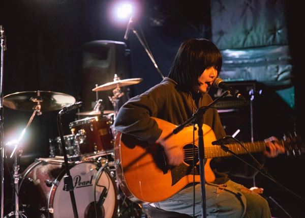 いきなりステージに現れ、一言も発さずに歌い始めたのは「帰り」と題されたごく小さく歌うモノローグのような曲。その場で生まれた感情をダイレクトに発する歌とギターに音量の大小は関係なく、オーディエンスは全身の感覚を開いて見入っている。長い前髪に隠れているが、少年性が溢れだす甘さとストイックさが同居する歌は表情以上に雄弁だ。間髪入れずにタイトル通り行動に移す前にこねられる理屈に思い当たるフシがある「偏見」、短く謝辞を述べ、代表曲「勝手な彼女」へ。音源ではバンドアレンジも聴けるこの曲を弾き語りでも聴き劣りしない多彩なリフで表現する。弾き語りならではの自由な緩急でスローな「ラリーボーイ」で、景色も体感もガラッと変えていく。SoundCloudに上がっているこの曲の宅録っぽい“近さ”がライブでも損なわれていない。人に曲を届けるということが必ずしも増幅の一方向じゃないことを証明する親密な表現を成り立たせているのは、身も蓋もないが気迫だ。