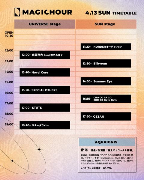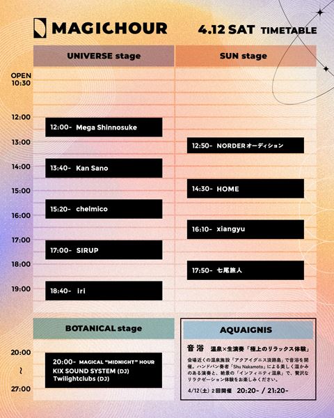 すべて見る「音楽と"魔法のような時間"を。」をコンセプトに、4月12日(土)・13日(日)の2日間、淡路夢舞台/明石海峡公園リゾートフェスにて開催される『MAGICHOUR』のタイムテーブルを発表した。