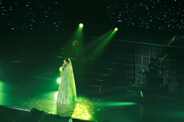 今ツアーの見どころとなる自らデザインを手掛けた豪華衣装を次々に着替えながら迎えた終盤パートでは、ミントグリーンのプリーツドレス姿でステージへ戻り、大歓声が鳴り響くなか代表曲「桜色舞うころ」、「雪の華」を全身全霊で熱唱し、本編を締めくくった。