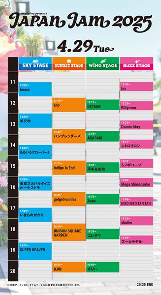 すべて見る4月29日(火・祝)、5月3日(土・祝)・4日(日・祝)・5日(月・祝)に開催される音楽フェス『JAPAN JAM 2025』の各日タイムテーブルが発表され、併せてチケットの第4次抽選先行もスタートした。