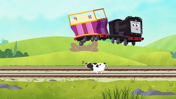 今回公開されたのは、そんなトーマスたちの奮闘ぶりがユーモアいっぱいに収められた場面写真。勢いよく走り出す元気なトーマスやパーシー、飛び出してきた牛さんを避けようと飛び跳ねるディーゼルなど、ダイナミックかつパワフルな姿が印象的だ。