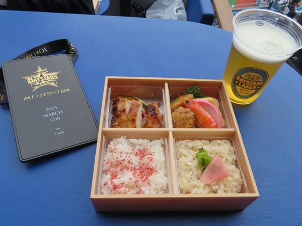 AKT エグゼクティブBOXは前方5名・後方3名の合計8名で利用するボックス席となっている。サービスとしてひとボックスにつきBAYSTARS LAGER10リットル、樽ハイ倶楽部レモンサワー10リットル、弁当8つ、オリジナルチケットホルダー8個(※公式戦のみ)が付いてくる。各ボックスともに電源タップ2か所と簡易荷物棚も完備。季節によって寒さをしのぐヒーター、暑さをやわらげる送風機も各1台設置される。気になる価格はオープン戦が8名1組で12万円、6月までの公式戦が8名1組で20万円となっている。