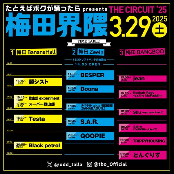 すべて見る3月29日(土)、梅田BananaHall、Zeela、BANGBOOの大阪・梅田の3会場で開催されるライブサーキット『梅田界隈 THE CIRCUIT ’25』のタイムテーブルが発表された。計16組が出演し、各会場それぞれ、Black petrol、QUUPIE、どんぐりずがトリを務める。