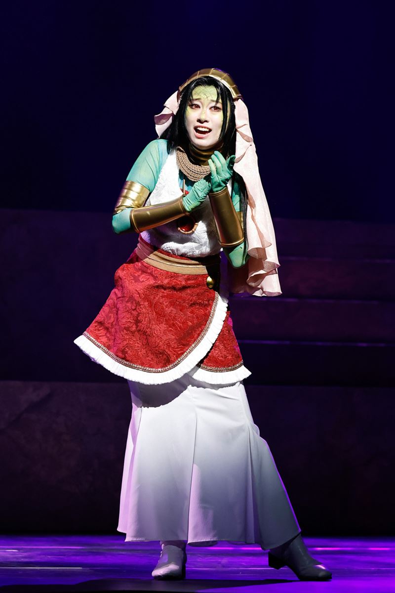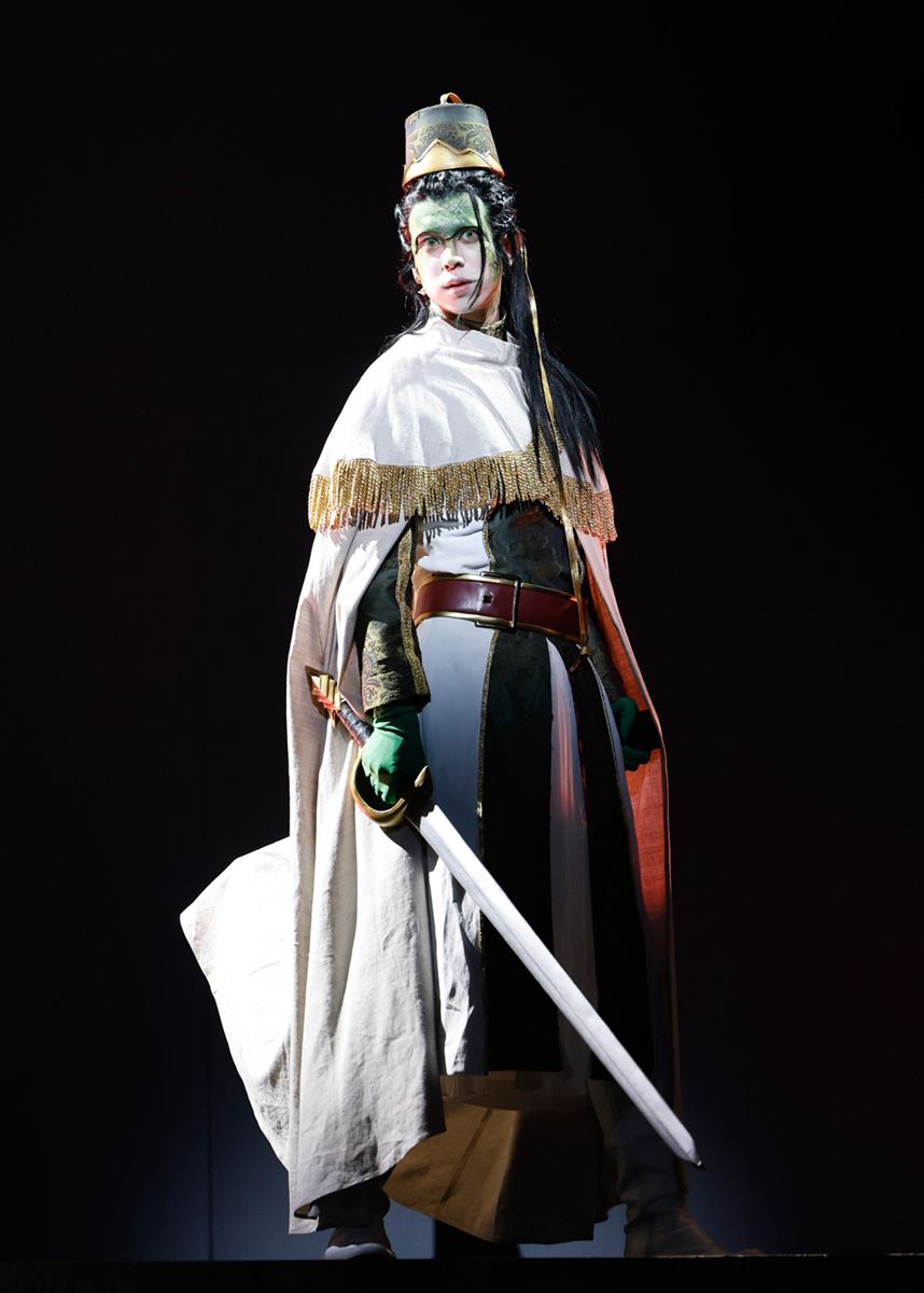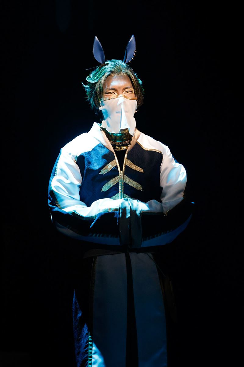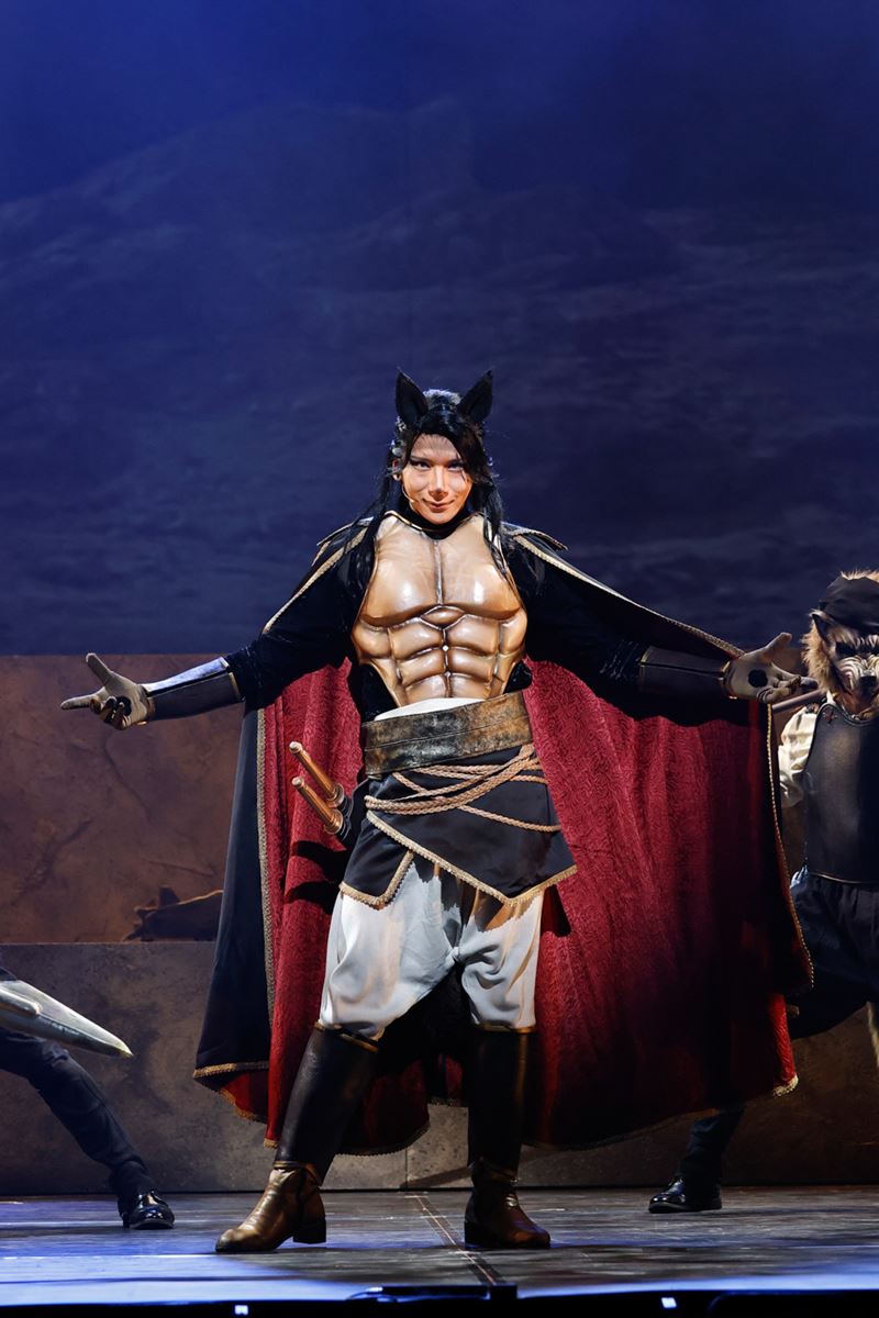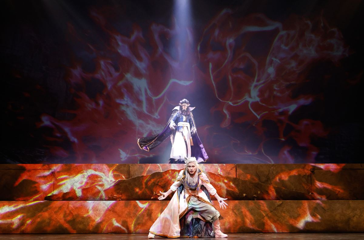 幕が開き、最初に目を見張るのが、レオンハートをはじめとする魔族たちのメイクと衣装のすごさ。既に昨年の段階でキャラクタービジュアルが公開され、大きな話題を呼んでいたが、実際にステージ上で魔族たちが躍動するさまを見ると、その精巧さ、質感に改めて驚かされる。レオンハートのモフモフの毛並み(肉球やシッポも見事に再現!)や一見、恐ろしげなビジュアルはもちろん、緑色の肌を持つ爬虫族の近衛隊長・ヨルムンガンド(京典和玖)やアミト(永利優妃)のビジュアル、さらには指輪や剣や防具といった小道具に至るまで緻密に再現されており、違和感なくすんなりと魔族たちが暮らす世界の物語に入っていくことができる。