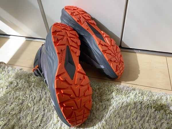 普段24cmサイズの靴を履いている筆者は、一番小さい24.5cmのミストグレーを購入。靴底がオレンジ色でデザイン性もおしゃれです。