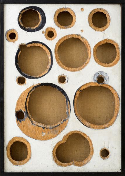 日本で初の本格的な個展となる今回は、西洋とポーランドの戦後美術を中心とした現代美術の伝統と、日本の伝統の双方をルーツにもつ鴨治の、独自の世界観を紹介する。例えば、彩色した板に穴を開けたレリーフのような、「プルシュクフ絵画群」は、初期の代表的なシリーズだ。そのなかから「お寺の壁に」シリーズ、《ラグーン》といった作品を通じて、素材をシンプルに扱う手つきがうかがえる。