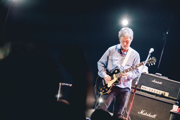 続くMCで、5月28日(水)にニュー・アルバム『あのみちから遠くはなれて』がリリースされること、その略称は『アミーチー』であることを伝えた田中。オーディエンスと「アミーチー!」のコール&レスポンスを交わしてから、ギターを置いてブルース・ハープを手にし、「天使ちゃん」に入った。田中の割れた音のブルース・ハープが響き、西川弘剛(g)のギター・リフが殴り込み、田中のトーキング・ブルーズのあと、サビでいきなり美しいメロディが降ってくる──現在の日本のロックにおいてあきらかに異形だし、GRAPEVINEのレパートリーとしても過去になかった、でありながら難解さとは程遠い、4分53秒の中でいくつもの魔法が起きているこの曲に、オーディエンスはじっと耳を傾け、演奏が終わると、長く大きな拍手を贈った。