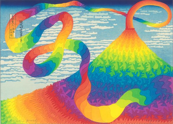 同展は、この財団が運営するアダチ版画研究所の彫師・摺師と協働で制作された木版画を紹介する展覧会。協働するクリエーターたちは、漫画家や美術家、デザイナーなど、総勢85名に及ぶ。おなじみのキャラクターを登場させて現代の浮世絵を生み出した水木しげる、楳図かずお、安野モヨコ、石ノ森章太郎ら漫画家たちや、江戸時代の北斎の作品がもつデザイン性にインスパイアされた粟津潔、浅葉克己、佐藤晃一、松永真らデザイナーたち。あるいは、1970年代から2000年代にかけて、伝統木版画の彫師・摺師たちと新たな浮世絵を制作することを試みた画家や建築家、イラストレーターたち、さらに2010年代以降に協働した世界的な現代アーティストたちなど、多彩な顔ぶれの現代の絵師たちの多様な表現に出会えるのが同展の魅力だ。