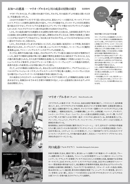 今回の公演では、川口がエラールの1840年製フォルテピアノを使用し、ブルネロの使用楽器である1600年代初頭製「マッジーニ」との絶妙な響きのもとに、古典派からロマン派まで多彩な魅力に満ちたプログラムをお送りする。幕開けは、ベートーヴェンの『ヘンデルの「ユダ・マカベア」の「見よ勇者は帰る」の主題による12の変奏曲』。表彰式のBGMとしてもなじみ深いあの旋律が、絶妙な掛け合いによって魅力的に展開される。続くシューベルトの『アルペジョーネ・ソナタ』は、すでに姿を消した楽器「アルペジョーネ」のために書かれた珠玉の名曲だ。そして、ベートーヴェンの弟子として知られるリースの『3つのロシアの歌による変奏曲』が演奏される。古典派の伝統を継承しながらも初期ロマン派の情感も感じられる作品で、当時流行したロシア音楽への関心を反映した珍しい作品だ。最後を飾るのは、ロマン派音楽の神髄を体現する作品、メンデルスゾーンの『チェロ・ソナタ第2番』だ。昨秋の初共演で演奏された第1番に続き、今回は第2番に挑む。