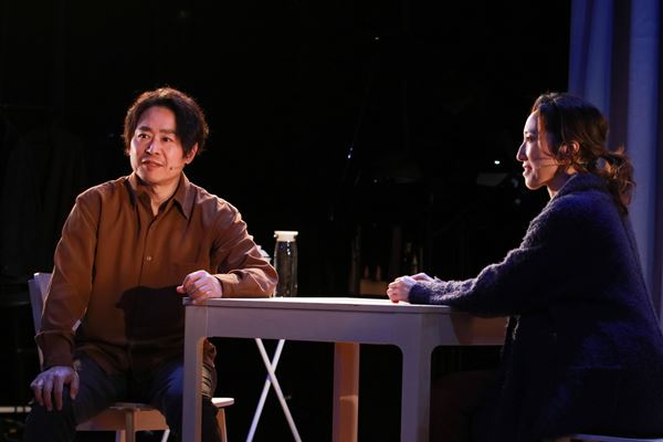 ピアノが音楽を奏で始めると、坂元健児と水夏希が登場し、豆を挽いてコーヒーを淹れる朝の風景が描かれる。思いやりは感じられるがどこか他人行儀な雰囲気に、この二人はどんな関係なのかと引き込まれた。水も坂元も、お茶目な表情から憂いを帯びた表情まで幅広く見せ、一つひとつの言葉を丁寧に届ける。間の取り方や声のトーンなどでも二人の性格やこれまでに築いてきた関係性などを想像させてくれた。