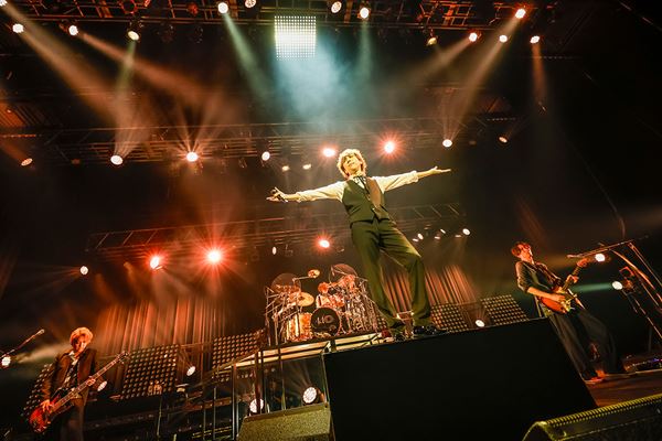 ステージに“SID 410”という文字の電飾が灯り、SEに乗せてゆうや(ds)、明希(b)、Shinji(g)が順に登場し、各自センターのお立ち台でポーズを決めてから立ち位置へ。最後に白いジャケットを着たマオ(vo)が登場すると、ステージを端から端まで練り歩いた後センターへ戻って仁王立ち。背を向けてスタンバイしていた明希とShinjiが正面を向き、Shinjiが右手を高く挙げたのを合図にピアノのイントロが鳴り「涙雨」が始まると、どよめきが起きた。この日の横浜の夜は偶然にも雨。青と緑を中心とした光に包まれて、4人はしっとりとした哀切を歌と演奏で表現していく。大拍手の中「MUSIC」のイントロが始まり、一挙にはっちゃけたムードに切り替わると、メンバーはステージを動き回って華やかにパフォーマンス。この日、ゆうやのドラムセットの左右には階段が設けられていて、メンバーが駆け上ったり腰掛けたりすることで、4人の様々なフォーメーションが生まれていたのも視覚的な楽しさを生んでいた。