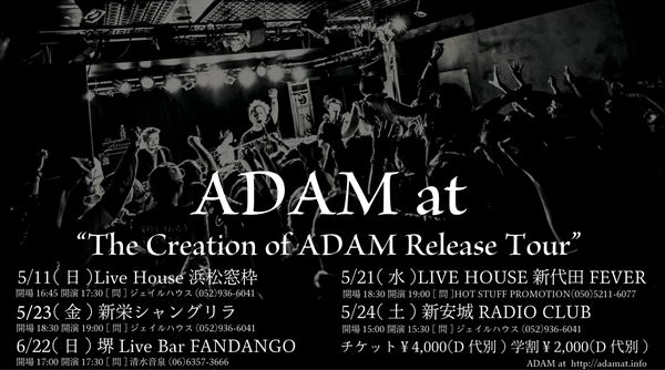 ADAM atは、1月にベスト・アルバム『The Creation of ADAM』をリリースし、今作を引っ提げたリリースツアー『The Creation of ADAM Release Tour』を5月11日(日) 静岡・浜松公演を皮切りにスタート。各会場にて『The Creation of ADAM』購入者にサイン会を実施予定。
