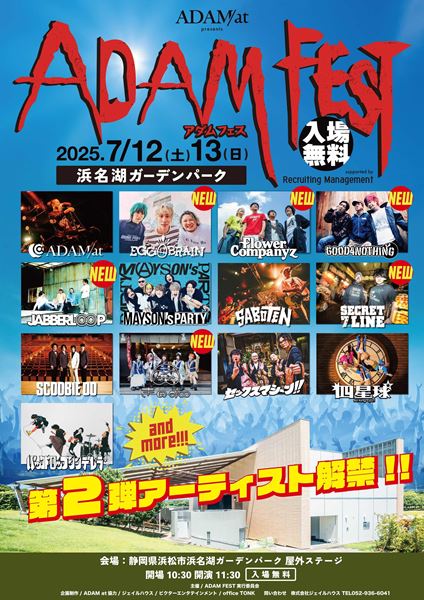 『ADAM FEST2025』は、ADAM atの地元・静岡県浜松市で毎年開催され、今年も浜松・浜名湖ガーデンパークにて7月12日(土)・13日(日)の2日間にわたり入場無料で行われる。