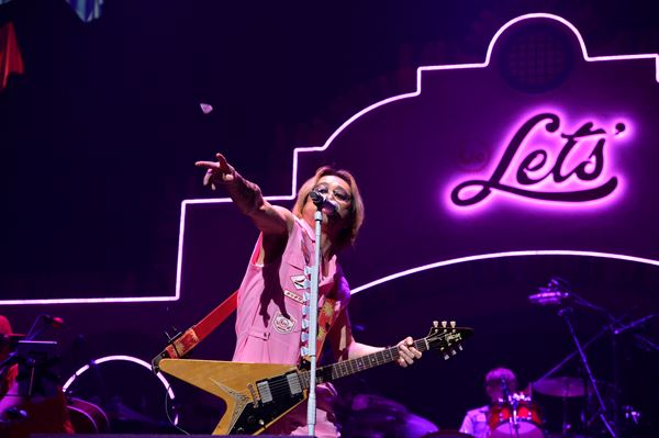 「こんばんは、ユニコーンです! 昨日もここでやったんですけど、東京ガーデンシアターは初めてで、今日が最後です」と奥田。真っ赤なテレキャスターに持ち替えて、痛快なロックンロール「頼みたいぜ」に突入する。なんともエネルギッシュな還暦ギタリストのプレイに、オーディエンスは盛り上がる一方だ。ちなみにこのブロックのセットリストは「頼みたいぜ」、「はいYES!」、「サービス」となっていて、曲のタイトルと並べると誰かに何かを頼んだときの反応そのままになっていて、笑ってしまう。ユニコーンはセットリストでも遊んでしまうのだ。
