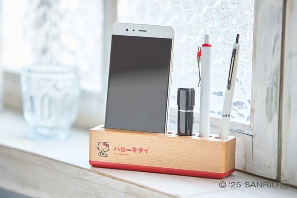 ペンやスマートフォンを差し込むことのできる「デスクスタンド」は、シンプルな形状に、キティちゃんのイラストと赤のカラーリングが映えるアイテム。