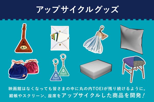 クラウドファンディングでは、長年劇場で使用されてきたスクリーン、緞帳、座席シートなどをアップサイクルし、数量限定のメモリアルグッズとして提供する。返礼品のラインナップには、座席生地をパッチワークしたスツール、スクリーンを再利用したカードケースなどの小物、緞帳を活用した巾着やクッション、座席札を使用して制作するラゲッジタグなど。さらに、丸の内TOEIで使用されていた座席、タイムテーブル、座席表や『日本戦歿学生の手記 きけ、わだつみの声』のフィルム缶などの貴重な現物も用意されている。