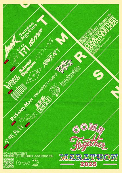 すべて見る7月12日(土)に日本の最新インディーズバンドの音源を取り扱うセレクトショップ"HOLIDAY! RECORDS"と心斎橋ライブハウス"LIVE HOUSE Pangea"が共催する、「応援する若手バンドをもっと沢山の人に見てもらいたい!」の主旨でバンドを集めてLIVE HOUSE Pangeaで不定期に開催してきたイベント「COME TOGETHER」の拡大版となる、ライブサーキットイベント「COME TOGETHER MARATHON」(通称:CTマラソン)を今年も開催する。