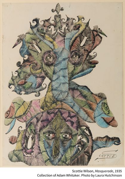 精霊に導かれて女性をモチーフとしたインク画を描いたマッジ・ギル、動植物やピエロなどを混合したシュルレアリスムのようなインク画を描いたスコッティ・ウィルソン、無計画な数枚の鉛筆スケッチから手の赴くままに描くジェシー・ジェームズ・ネーゲル、明るくポップな陶芸、刺繍作品をつくるキャメロン・モーガンなどなど。それぞれ独創的で引き込まれるに違いない。