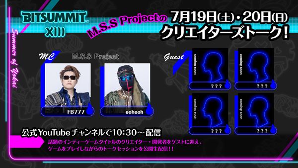 オフィシャルPRサポーターズには、しんじさん、葉、M.S.S ProjectからFB777・eoheohなどの人気配信者・クリエイターたちが、ライブ配信やキャンペーン、ステージ出演などさまざまな形でBitSummitを盛り上げる。また、現地リポート配信として、いちごうのゲームビート 、ギン、おーでしゲームレビューchが当日のレポートを各チャンネルで実施する。