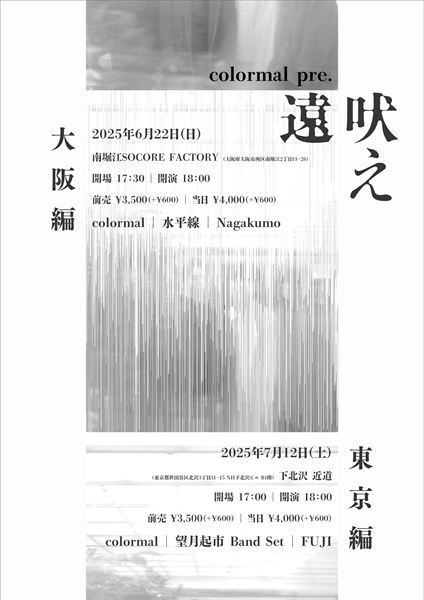 さらに、6月22日(日)大阪・南堀江SOCORE FACTORY、7月12日(土)東京・下北沢近道にて自主企画『colormal pre.「遠吠え」』を開催。大阪編は水平線、Ngakumo、東京編にはFUJI、望月起市 Band Setをゲストに迎える。