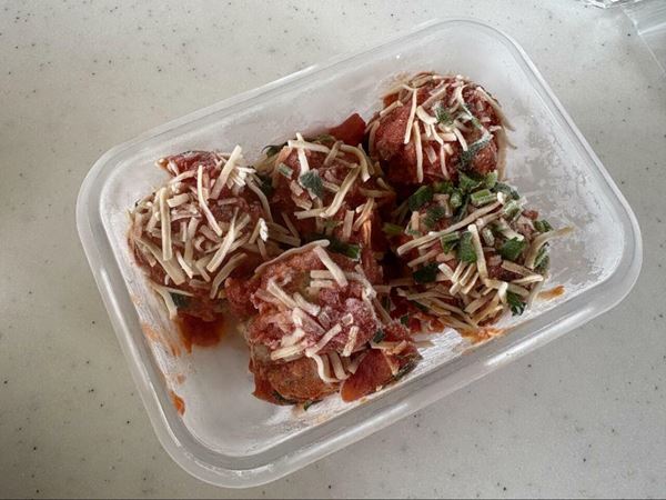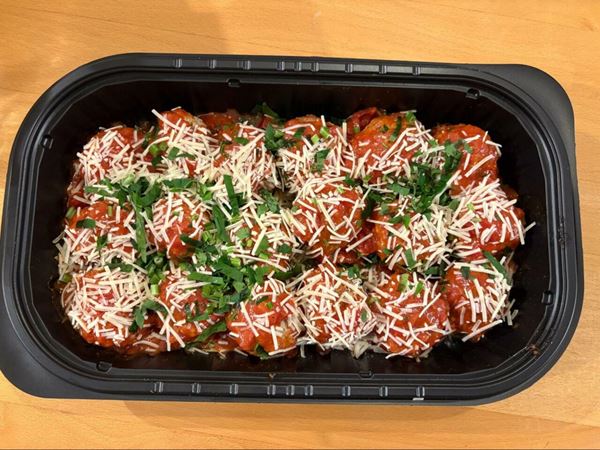 たっぷりのトマトソースに、仕上げのチーズとハーブがトッピングされていて、見た目の華やかさも◎。電子レンジ(500W)で約10分加熱すれば、トマトソースがぐつぐつ煮立ち、ミートボール全体がアツアツに仕上がります。