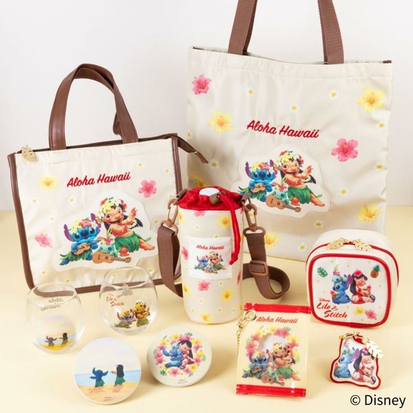 フラ衣装とレイで飾ったリロとスティッチのバッグや、保冷ボトルホルダーなども登場。