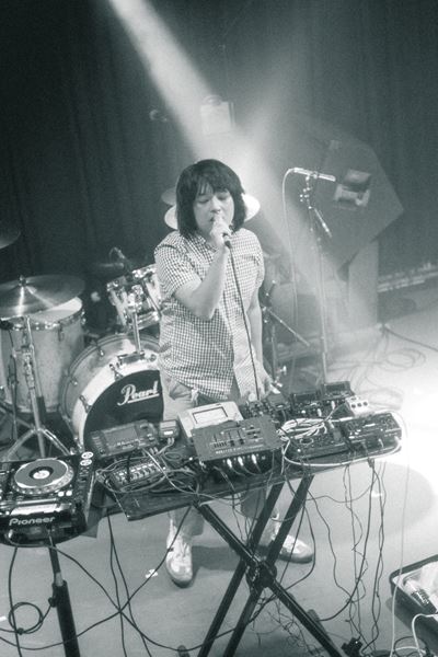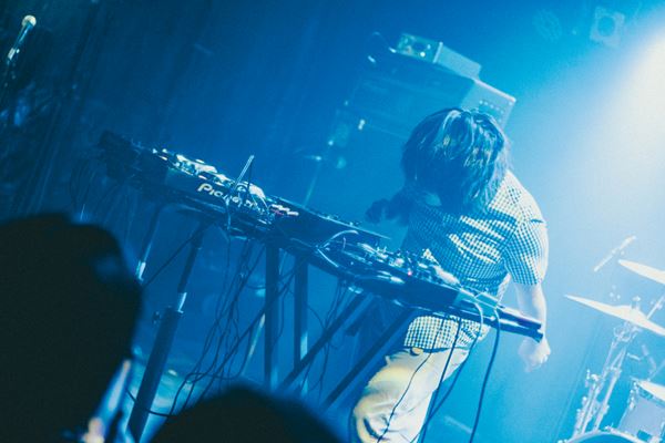 最初にステージに姿を現したのは、2020年より本格的に活動を開始し、No Busesのギターボーカルとしても活躍するCwondo。DJスタイルでの彼のライブパフォーマンスは、アヴァンギャルドながら、彼の人柄を体現する実に優れたパフォーマンスだった。機材の前に立ち、冒頭からノイジーな音を掻き鳴らす。轟音がフロアを包むと、オーディエンスはそのサウンドに呼応するように頭を、体を揺らしている。不穏な雰囲気を纏いながら音を自由自在に操るその姿。飄々とパフォーマンスを続けるCwondoは被っていた帽子を振り落とすように頭を振り、オートチューンを掛けた自身の声までも音の一部として使いこなし、破壊と想像を繰り返すように、ビートを重ねていく。「Cwondoです」と自己紹介すると、フロアはさらに熱を帯びる。ノイジーな音像が鳴り響く中で、繊細な鍵盤の音色、胸に響く太いビートなど、さまざまな音を用いながら、フロアをCwondoの色に染めていく。実験的とも言える彼のパフォーマンス、巧みに音を繋げる彼のプレイにオーディエンスは熱狂し続けている。時折覗かせる彼の歌声に耳を奪われていると、「このまま続けようと思っていたけどダメでした」と口を開いた。