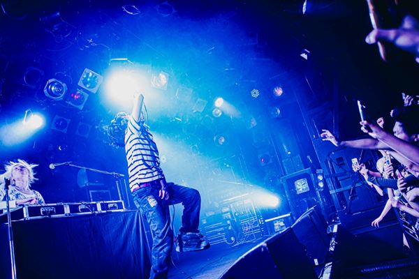 「俺も、バンドをはじめた当初はこんなに客が入ると思ってませんでした」と、翌日幕張メッセで開催される「SATANIC CARNIVAL 2025」に出演することに触れ、「ここまでこれてマジで幸せです。最近、新曲を出しましたけど、こうやって幸せだと思っているけど、俺はめちゃ貪欲で。死んでから納得して満たされると思うんです。そんな俺を見てくれるお前らが大好きだ。そんなお前らを肯定する曲!」と、「キミがキミでいてほしいから」へ。ノイジーでインダストリアルなビートをブリッジに、メロコアとデジタルハードコア、青春パンクがミクスチャーされた「僕の心臓をフェラしてくれ」など一気に畳み掛けていく。