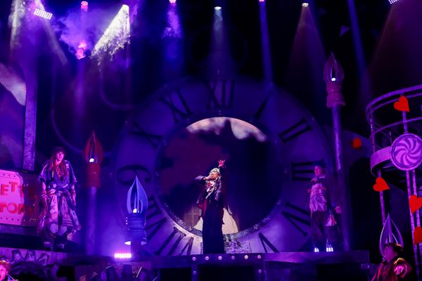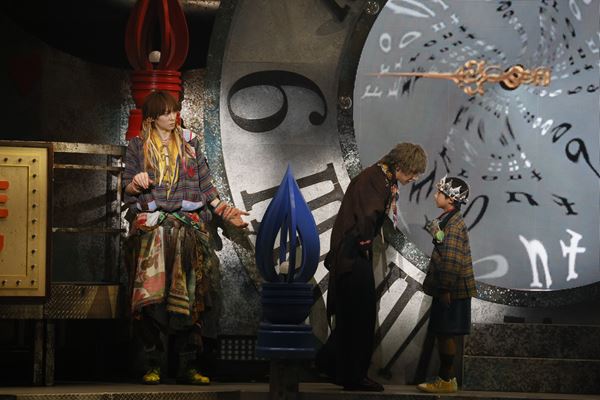 作品の世界観がそこかしこにあしらわれたロビーを抜けて劇場に足を踏み入れると、物語の舞台となる工場「パレットファクトリー」が現れる。時計や歯車などのモチーフがあしらわれたスチームパンク感あふれるセットだ。無彩色のセットの中に、キャラクターと連携した色とりどりのランプが映える。