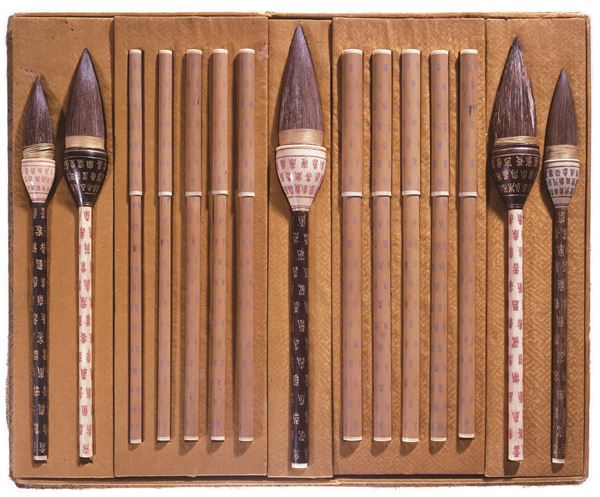 永青文庫の設立者、細川護立(ほそかわもりたつ、1883~1970)もそうした「文房四宝」を愛好したひとり。禅画や刀剣、日本近代絵画の収集で知られる護立だが、幼少期から漢籍に親しみ、中国の陶磁器や仏像に関心を広げ、文具も収集していた。晩年の護立は、夕食後に必ず硯と筆を用意させ、書に親しんだという。今回の展覧会では、細川家で大切にされた90点以上の文房四宝を再調査し、その中から選りすぐりの60点あまりを20年ぶりに展示。「硯で墨をすって筆で紙に書く」という行為を彩った文具の数々を紹介する。例えば、兔・馬・鼬(いたち)・鹿・山羊の毛を用い、筆管(軸)に象牙や玉を用いた筆なども展示される。