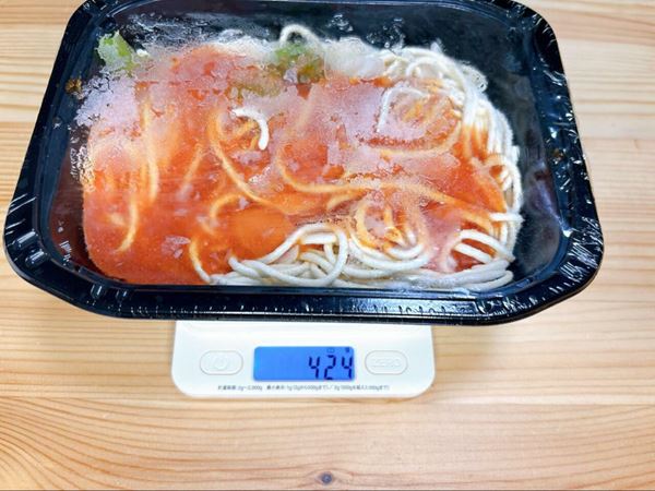 まず紹介するのは、お子様から大人まで大好きなナポリタン。400g入って、価格は214円(税込)です。実際に、中袋に入った状態で重さを計ると、424gありました。