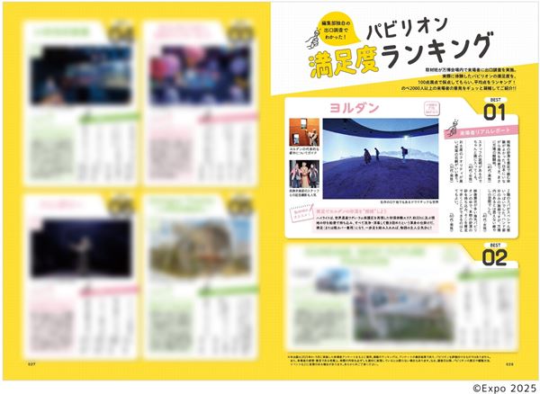 注目は、取材班が会場内でのべ2000人以上の来場者に出口調査を実施した「パビリオン満足度ランキング」。見事1位を獲得したのは「ヨルダン」で、世界遺産ワディ・ラム保護区を再現した砂漠体験エリアが人気となっており、来場者のコメントでも「現地の砂漠を素足で踏む体験がよかった」という意見が挙がっていた。ほかにも「お土産のクオリティが高い」「2階のスパがスペシャル感いっぱい」など、人気の理由がわかるコメントを多数掲載。そのほか誌面では、ランキング30位までを発表する。