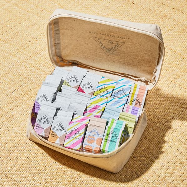 COFFEE STYLE UCCのメインブランドである『CAFE@HOME』が15種・24杯分入った内容。限定トラベルポーチは、シンプルなデザインと収納力が便利なアイテム。