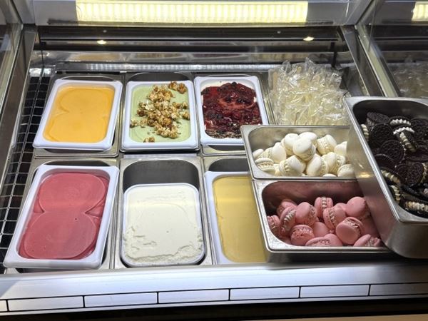 アイスクリーム、シャーベット、ソフトクリーム、アイスキャンディ、アイスクリームサンドイッチなど10種類以上に加えて、フローズンフルーツやナッツ類、マシュマロやチェリーコンポートなど各種トッピングもあり。