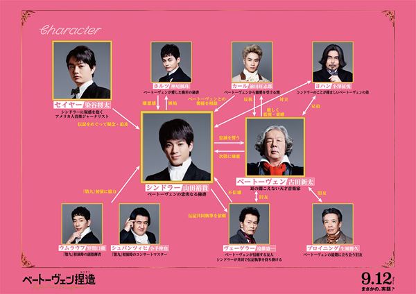 また、ベートーヴェンが愛した晩年の秘書・ホルツ役に神尾楓珠、ベートーヴェンから寵愛を受ける甥・カール役に前田旺志郎、シンドラーのことが疎ましいベートーヴェンの弟・ヨハン役に小澤征悦、ベートーヴェンの最期に立ち会う旧友・ブロイニング役に生瀬勝久、ベートーヴェンが遺した中でも最も有名な楽曲のひとつ、通称『第九』初演時のコンサートマスター・シュパンツィヒ役に小手伸也、耳の聞こえないベートーヴェンが『第九』初演時に指揮をする際、サポートとして副指揮を担当したウムラウフ役に野間口徹、そしてベートーヴェンが信頼する友人で、シンドラーが共同で伝記執筆を持ち掛けるヴェーゲラー役を遠藤憲一が演じる。