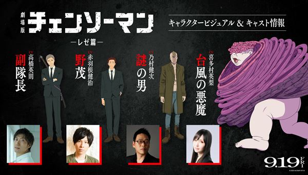 また、劇場版から登場する新キャストも発表。公安対魔特異2課の“副隊長”を高橋英則、同じく2課の“野茂”を赤羽根健治が演じる。さらに、「チェンソーの心臓」を狙う“謎の男”に乃村健次、規格外の破壊力を持つ“台風の悪魔”に喜多村英梨が決定した。