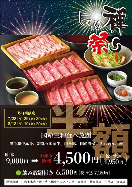 「しゃぶ禅祭り」<期間:2025年7月28日~30日/8月18日~20日>【9,000円コースが4,500円!黒毛和牛・霜降り国産牛・国産豚の食べ放題を半額で楽しめる「しゃぶ禅祭り」が開催されます!】