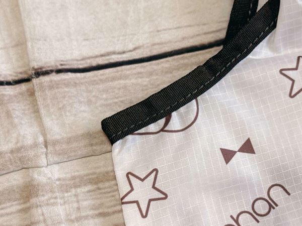 ファスナーで開閉する仕様で、中にエコバッグが入っています。エコバッグのデザインはなんと紗南ちゃんのお母さんが飼っているリスのまろちゃんの総柄!