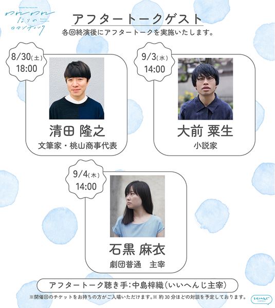 アフタートークには、恋バナ収集ユニット「桃山商事」代表として知られる文筆家の清田隆之、著書『ぬいぐるみとしゃべる人はやさしい』が映画化されるなど注目を集める小説家・大前粟生、「劇団普通」主宰の石黒麻衣が登壇し、中島とのトークが行われる。清田は8月30日(土) 18時公演終演後、大前は9月3日(水) 14時公演終演後、石黒は9月4日(木) 14時公演終演後にそれぞれ登場する予定だ。