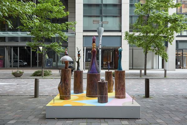 第44回となる今回は「都市の森に佇む命の共創」をテーマに4名が新たに作品を制作。さらに既存の3作品を入れ替え、展示作品は計17作品となった。2002年に丸ビルが新しく生まれ変わると同時に歩道の拡張や樹木の整備が行われた丸の内仲通り周辺だが、現在では高さ8メートルを超えるような街路樹が生い茂り、その枝葉を広げている。