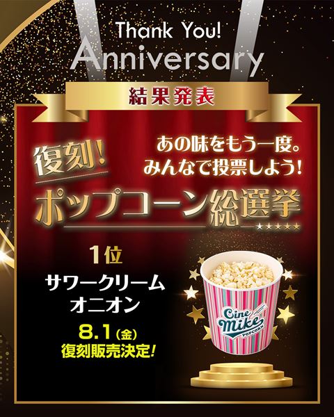 また、『復刻!ポップコーン総選挙2025 下半期』の開催も決定。4月14日〜5月31日に実施した『復刻!ポップコーン総選挙2025 上半期』では、16,194票の投票があり、サワークリームオニオン味が第1位を獲得。8月1日(金)より、全劇場にてサワークリームオニオン味が復刻販売される。