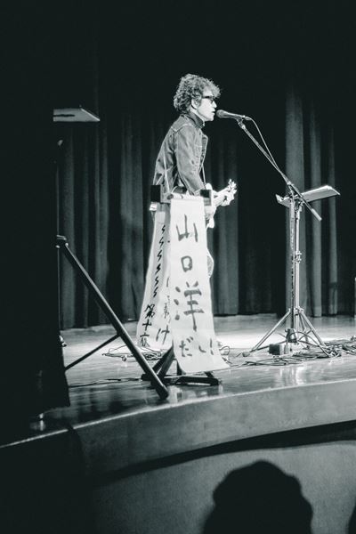 いつものように観光客や地元の人たちでゴッタ返す新仲見世通り~六区ブロードウェイ商店街を通り、浅草フランス座東洋館へ。“雷よ静かに轟け”で季節ごとに浅草に来られるのは何と赴きのあることよと思いながら会場に入ると、いつものように古いロックンロールが流れている。やっぱりいいなと伝統ある演芸場を雰囲気を味わっていると、“めくり”(寄席などの演芸場で、現在の出演者名を書いた紙製の札)がめくられ、そこには自筆による“山口洋”の名が。サングラスといいジーンズといいパーマの具合といい「ボブ・ディランじゃん!」と心のなかで叫びたくなる出で立ちの山口が1曲目に選んだのは「Don’t Look Back」。あまりにも滑らかなアコギの響き、と〈雨にも負け,風にも負け,組織にも負け/見上げたポーラスターがこうささやいていたDon't Look Back」〉というラインがスッと身体に浸透してきて、此処ではない何処かに連れ去られると同時に、わが身のこれまでを振り返ってしまう。〈亮介、Don’t Look Back〉〈君は円環の洪水だ〉というアドリブも楽しい。(”円環の洪水”とは“a flood of circle”のことだそうです)