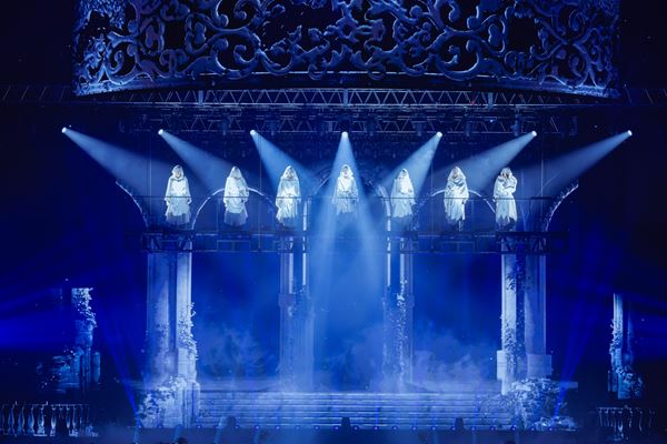 再びステージが眩い光に照らし出されると、メンバーたちは1人ずつ透明なボックスに入った状態で登場し、「フィナーレ」を歌い始める。全員が比較的カジュアルな衣装に身を包み、中にはアイウェアをかけているメンバーもいる。それは天使という存在を隠し、地上の世界に溶け込もうとしているかのようだ。ボックスに入ったままステージ上を移動、フォーメーションを展開しながらのパフォーマンスは実に斬新な演出だった。曲のラストでボックスから出た7人は時間が止まったように動きを止める。そして「蝋燭」のイントロをきっかけに動き始める。ミディアムテンポのR&B的ニュアンスを感じさせるサウンドに合わせ、ゆったりとしたステップを踏みながら、メロウな歌声が響き渡る。たくさんのキャンドルがほのかな光を放つ映像演出と相まって、グッと引き込まれる大人っぽいムードを届けてくれた。