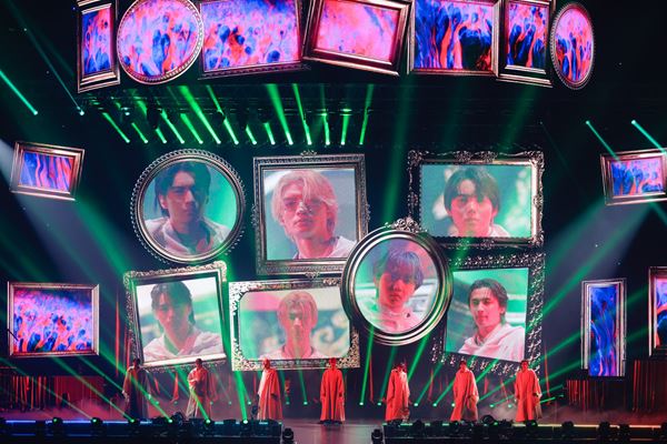 続いて披露されたのは「Operation Ego」。メンバーの顔やリリックが映されたモニター越しに、激しいパフォーマンスと哲学的なメッセージが鋭く届けられる。モニターが上空へと帰っていき、曲のラストでメンバーたちは何かを掴むかのようにグッと握ったコブシを突き上げた。「遊戯的反逆ノススメ」では花道を移動しながらメインステージへと移動。客席に背を向け、激しいダンスを見せることで背中の赤い羽根が観測者の眼を痛いほど焼いていく。「ハハハ、俺ら最高すぎんだろ?」(大倉)、「おい、まだ行けんだろ?」(杢代)と張りつめた空気を一切、緩めることなく「Paradox Re:Write」をドロップ。ステージ上には花火が吹きあがり、火柱も立ち上る。ボーカルがはらむ熱量はまだまだ増し続け、ダンスのテンションも衰える兆しはない。20曲を経たとは思えないほどのパワーを7人全員が放出し続けている。