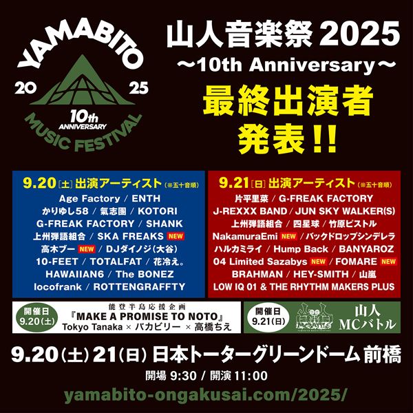 『山人音楽祭2025』は、今年、記念すべき10年目の開催を迎える、群馬出身・在住のロックバンド、G-FREAK FACTORY主宰ロックフェス。