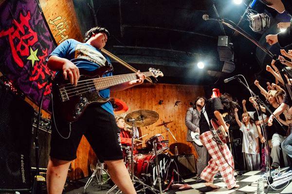 ステージからはみ出しそうな勢いで演奏するメンバーたち。この日の転換DJが、超☆社会的サンダルのふじおの父・ジオッパであることを明かしフロアを盛り上げると、リズミカルな演奏に合わせて<世界滅亡>とコール&レスポンスをし、オールドスクールなロックンロールで観客たちの身体を揺らした。鈴木は、過去に学校生活でいじめられたことを語り、「そいつのおかげでブルーハーツを知ってバンドを始めた。苦しいけれど、それがあって今があるともいえる。たくさんの感情を置いて、綺麗な気持ちで天国にいきたいと思います」と語り、鬼気迫る表情とともに歌い上げた。
