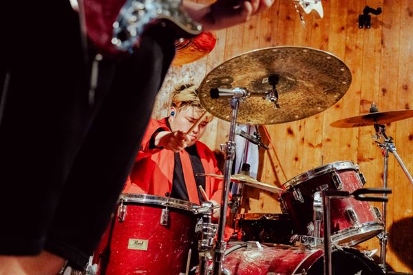 約20分のDJタイムを経てステージに登場したのは、シンガー・ソングライターの叶芽フウカ。真っ白な衣装に身を包み、抱えたアコースティックギターを思い切りかき鳴らすと、「世界滅亡、知ったこっちゃねえ! いくぞ!」と叫び、歌い始める。ハスキーでブルージーな歌声に観客たちは聴き入る。そこには、どこか緊張感も同居している。「ここで出会えてしまったことは運命でも必然でもない、美しすぎる偶然なんだ」とフレーズを歌うと、「このあと世界が終わろうとも、そういうSFだから」と、言葉を紡いでいく。ギターストロークのスピードが増すのと比例するように口早に歌う叶芽。ジャニス・ジョップリンを思い起こさせるようなブルージーな歌声と、可愛らしさを感じる歌声という幅の広さは、彼女の表現に大きな自由さを与えている。「(世界が)終わっても終わらなくても、<幸せにも孤独にもなりたくないから自由に踊りたいだけ>」と、詩的で哲学的な歌詞を言葉にしていく。