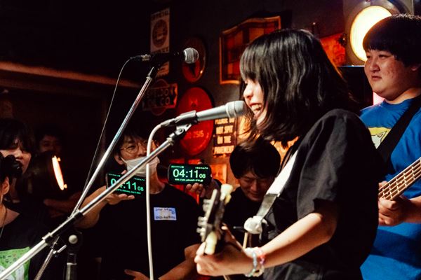 7月5日0時になったと同時に暗転。一番手としてステージに登場したのは、新潟県出身の4人組バンド、THE KING OF ROOKIE。THE BLUE HEARTSの「キング・オブ・ルーキー」が流れる中、なすのたかと(g/cho)、ワシミリョウ(b/cho)、 犬人間(ds/cho)が登場。初期衝動そのままにダイレクトに楽器を鳴らすと、ボーカルの鈴木琳(vo/g)が勢いよく登場。観客たちの拳があがる中、剥き出しのロックンロールを歌った。