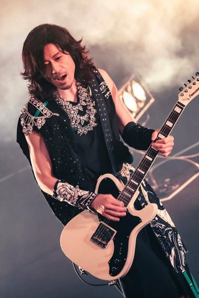 幕開けはアルバムと同様に「百万那由多ノ塵SCUM」。衣装は本公演のものにアレンジが加わり、スパンコールが付けられていて、今井、星野英彦(vo&g)、樋口豊(b)、ヤガミ・トール(ds)と順に演奏に加わっていくその動きに合わせて、キラキラと小さな光を放っていた。それはまるでオープニングSEでスクリーンに流れていた光の粒子を全身にまとっているようで、尊くてまばゆい。温かでたおやかな演奏を終えると、ギラギラに輝く軍帽を被った今井が「さあ始めようぜ、スブロサだ!」と高らかに宣言。ハンドマイクで「スブロサ SUBROSA」を歌い始めると、会場のボルテージは一気に上昇した。ステージのバックドロップには大輪の薔薇が一輪。ライトが当たるたびに表情を変え、ステージを見守ってくれているような、大きな愛で包んでくれているような、そんな気配を感じずにはいられなかった。会場の熱気をさらに煽るように、間奏で何度も繰り返し「スブロッサ!」と叫んでいた今井の姿は、このツアー中、初めて観る姿だった。