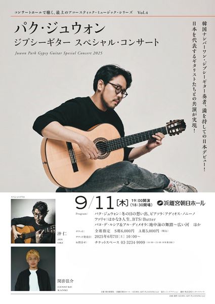 すべて見る韓国No.1ジプシーギター奏者、パク・ジュウォンの日本デビュー公演が、2025年9月11日(木)に、浜離宮朝日ホールにて開催される。今回は日本を代表するフラメンコギタリストの沖仁、クラシック&ジャズギタリストの閑喜弦介との夢の共演も実現する。
